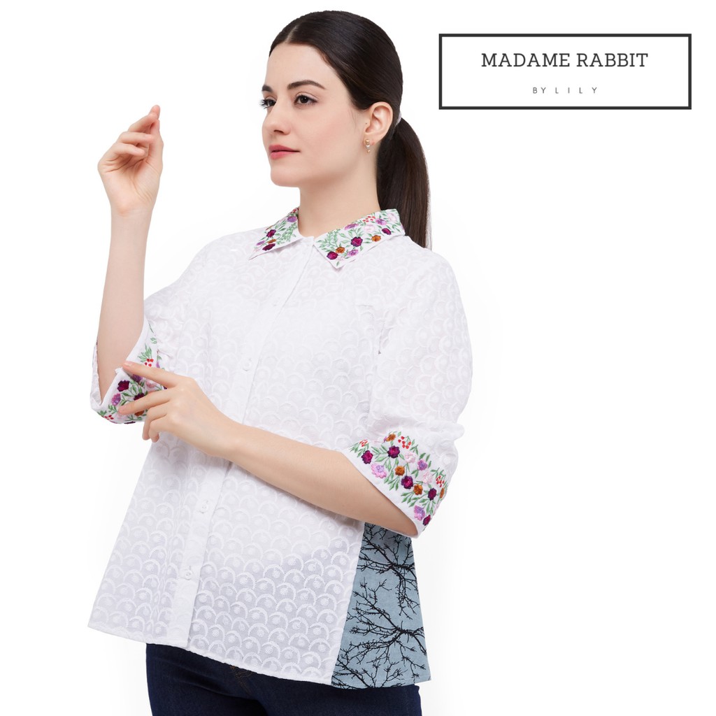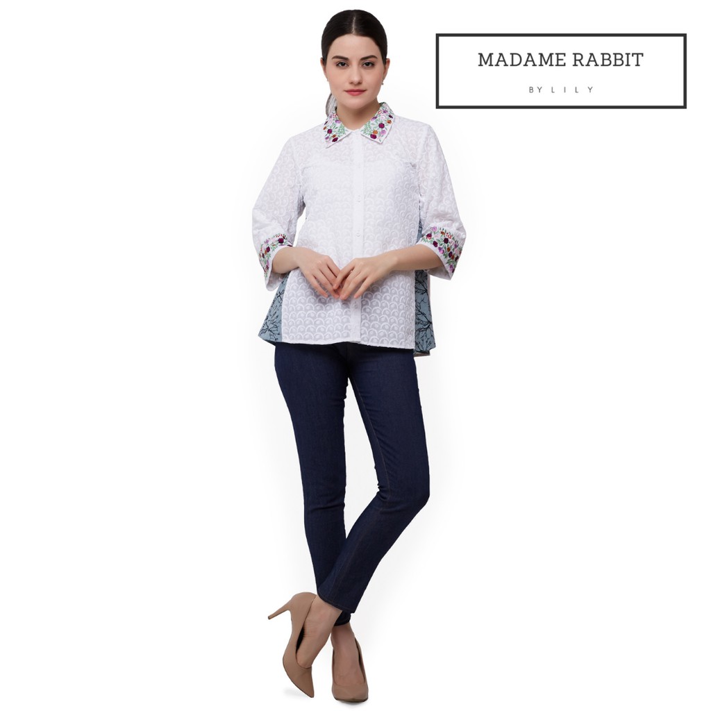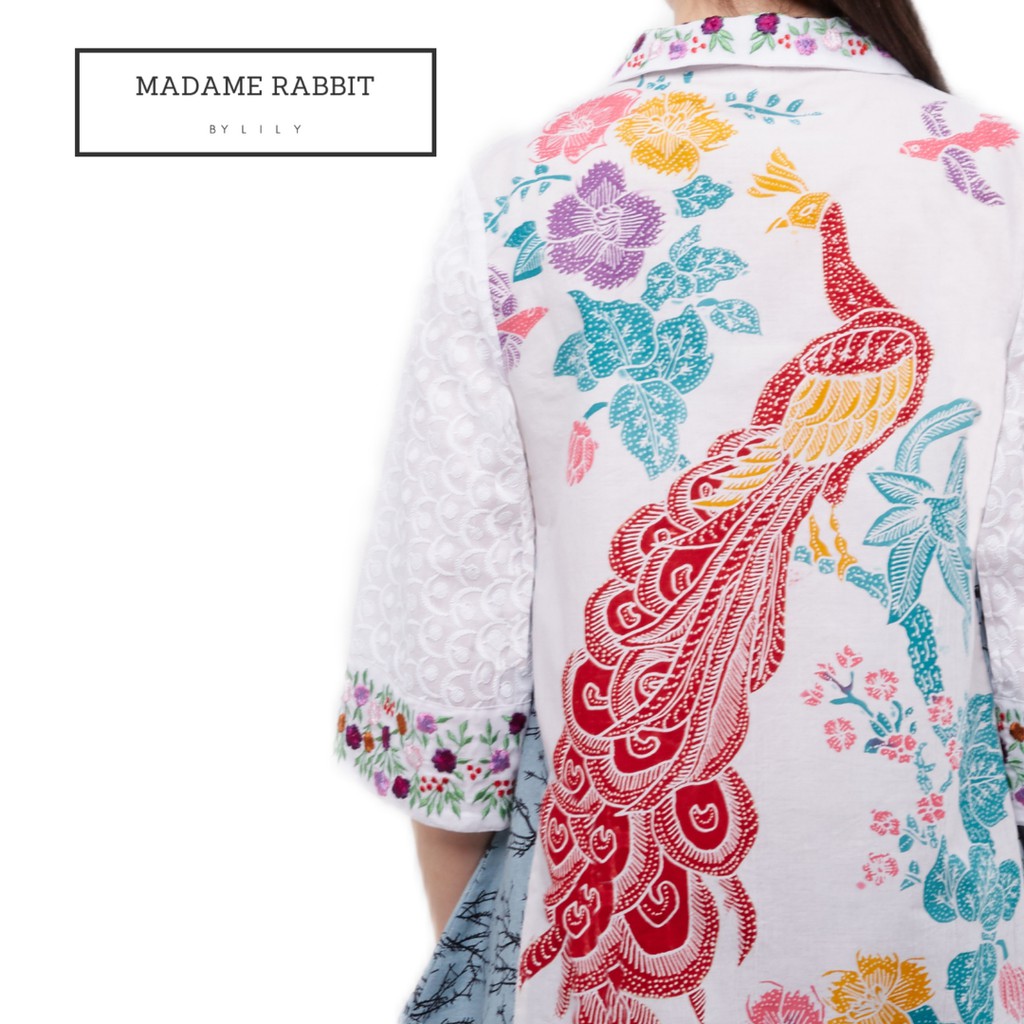 TERBARU! 8 Rekomendasi MADAME RABBIT - Kemeja Batik Wanita Putih Lengan Panjang Bordir Manual - Peacock in The Garden White