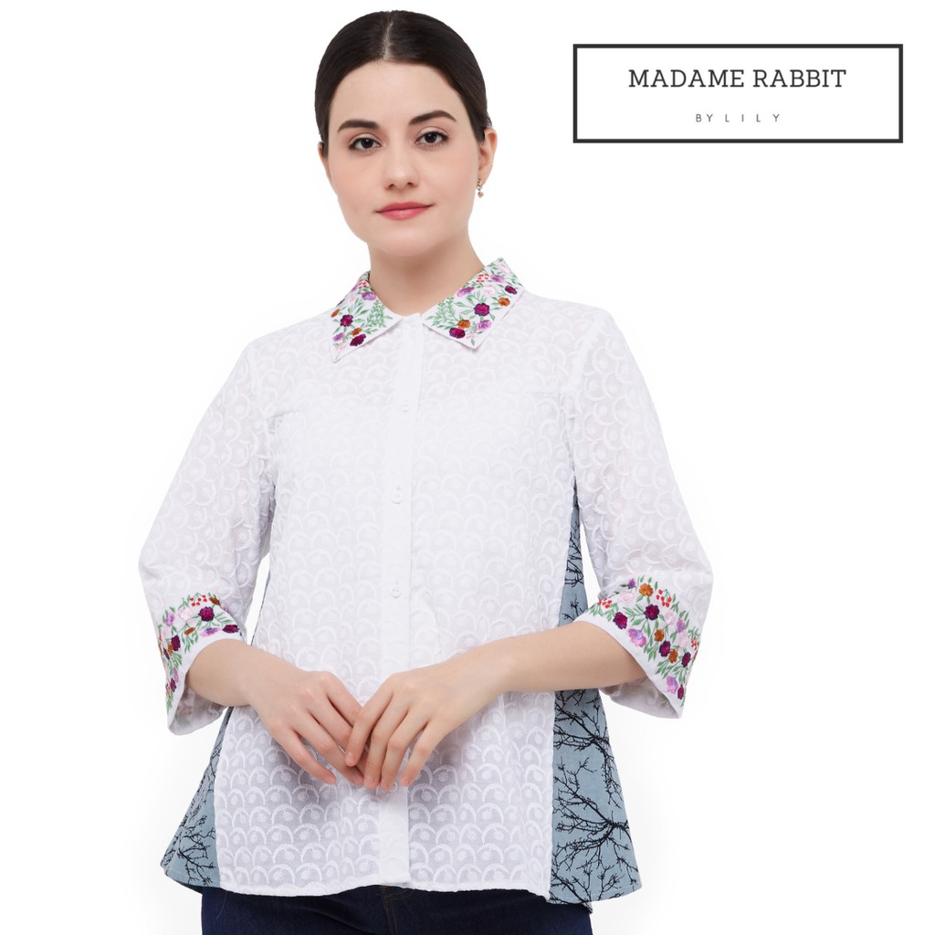 MADAME RABBIT - Kemeja Batik Wanita Putih Lengan Panjang Bordir Manual - Peacock in The Garden White